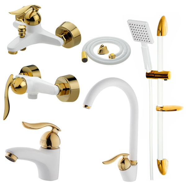 ست شیرالات سام طلایی xxx دوش حمام xxx شلنگ توالت سفید طلایی xxx شلنگ اتصال به شیر پیسوال سایز3/8 xxx آچار زیربندی