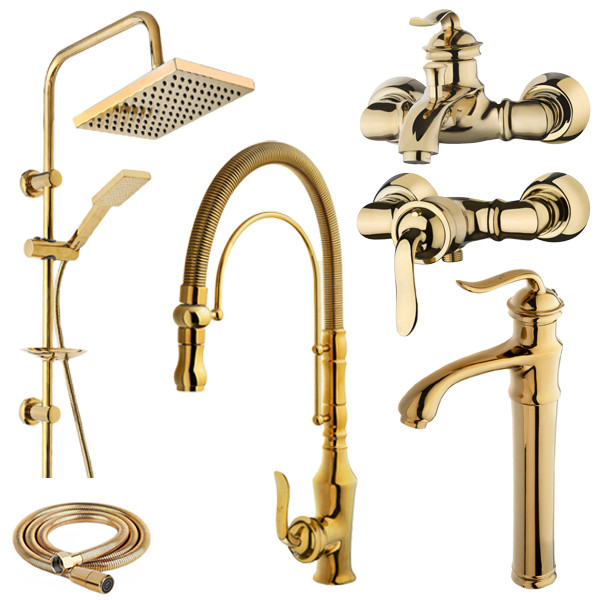 ست شیرالات هلن طلایی با ظرفشویی فنری و روشویی پایه بلند xxx دوش حمام طلایی xxx شلنگ توالت طلایی xxx