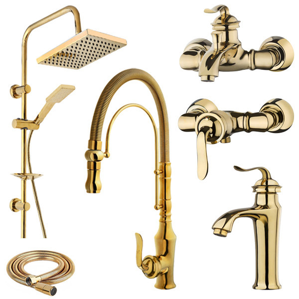 ست شیرالات هلن طلایی با ظرفشویی فنری xxx دوش حمام طلایی xxx شلنگ توالت طلایی xxx