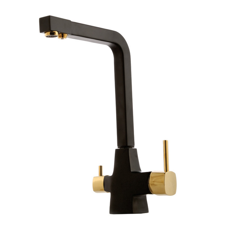 اقلام همراه : شیر اشپزخانه دو منظوره فلت مشکی طلا x آچار زیربندی x شلنگ اتصال به شیر پیسوال سایز 3.8 x